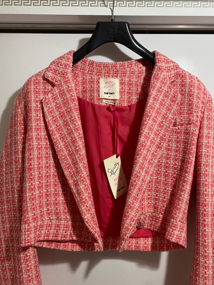 Pembe pastel renkli, tüvit kadın blazer ceket. Düğmeli, kısa kesim crop , uzun kollu etiketi üstünde hiç giyilmedi 40 beden etikette ama 36 bedene uygun (168 54 kilo birine tam oluyor aslında)
