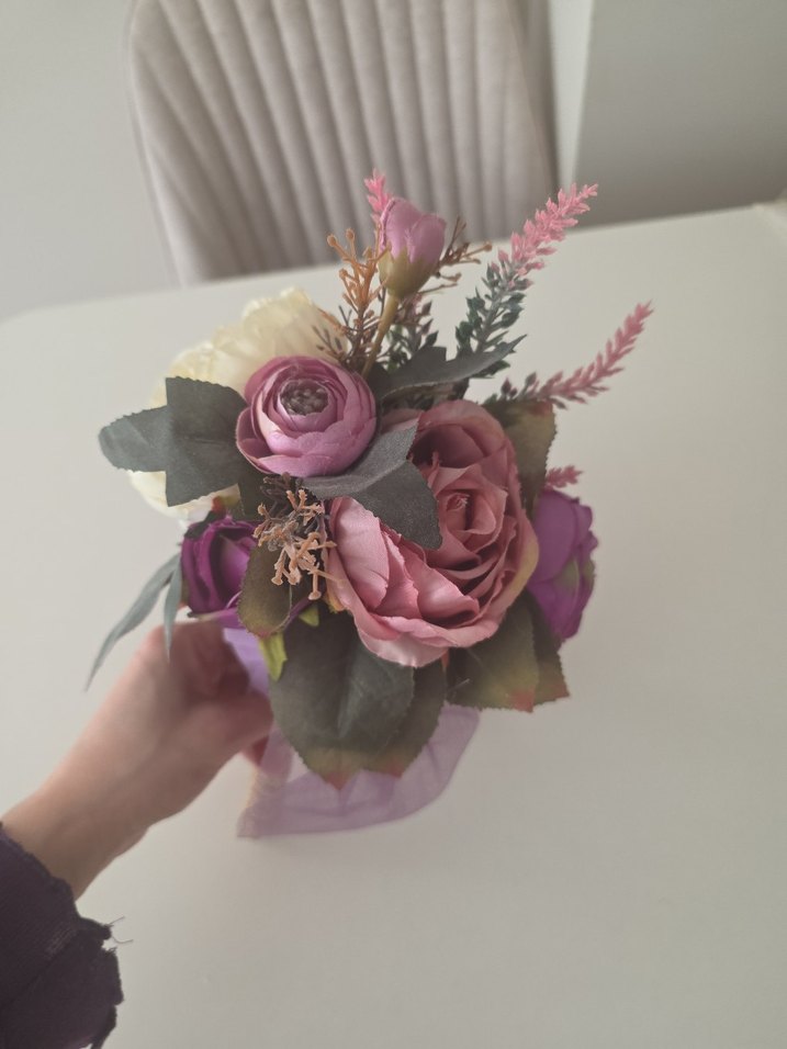 Pembe pastel renklerde çiçekler ve dantel detaylarıyla bohem tarzda gelin buketi, hippie ve retro tarzlara uygundur.