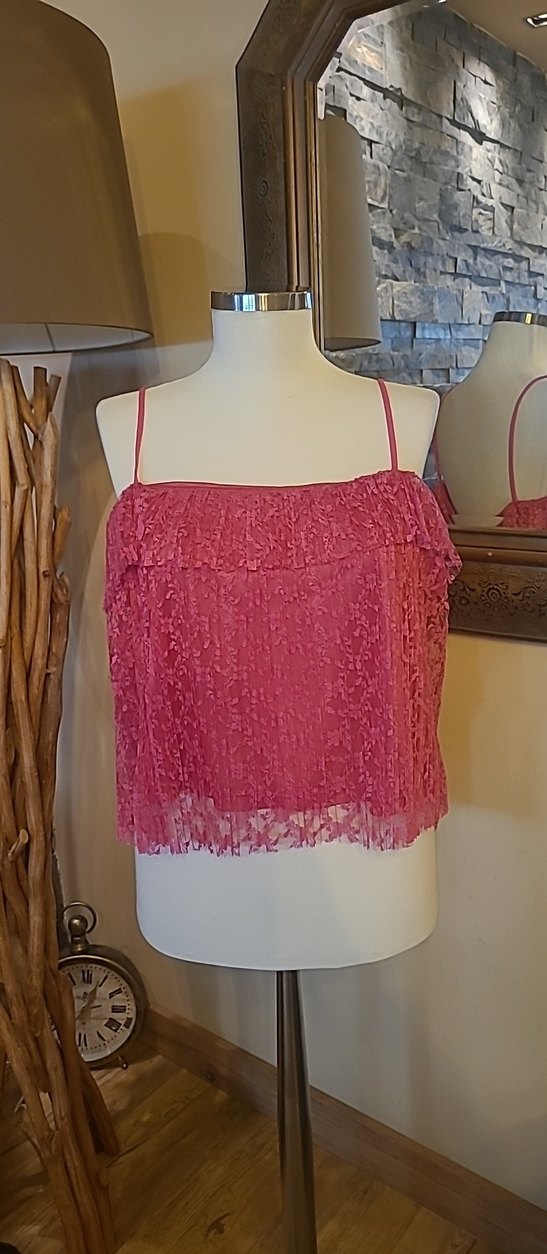 Pembe dantel kumaştan, ince askılı ve kolsuz, bol kesim midi boyda bohem tarzda büstiyer. Romantik akşamlar için uygundur.