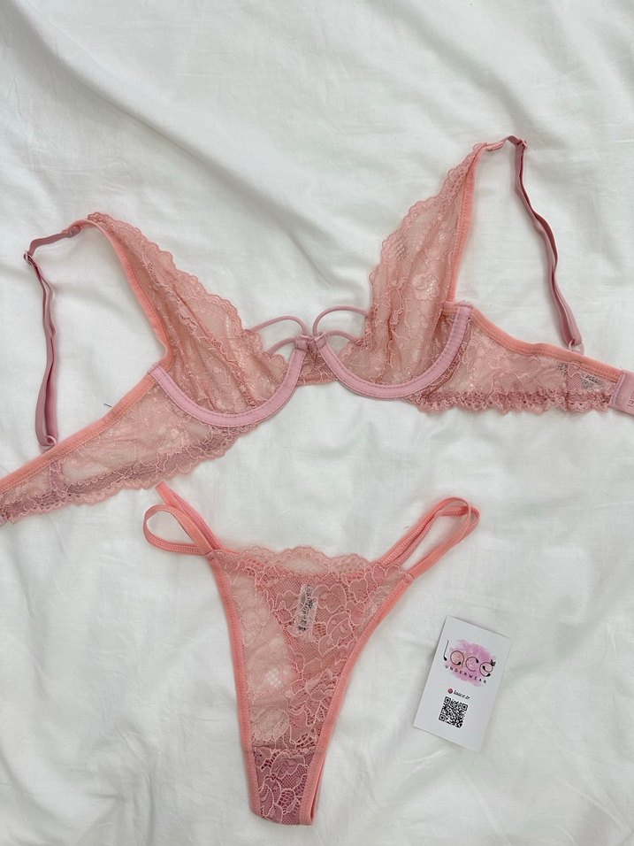 Pastel pembe renkte, bohem Parisian tarzında dantel sütyen ve tanga takımı. Desensiz ve normal boyda, zarif ve yumuşak bir görünüm sunar.
