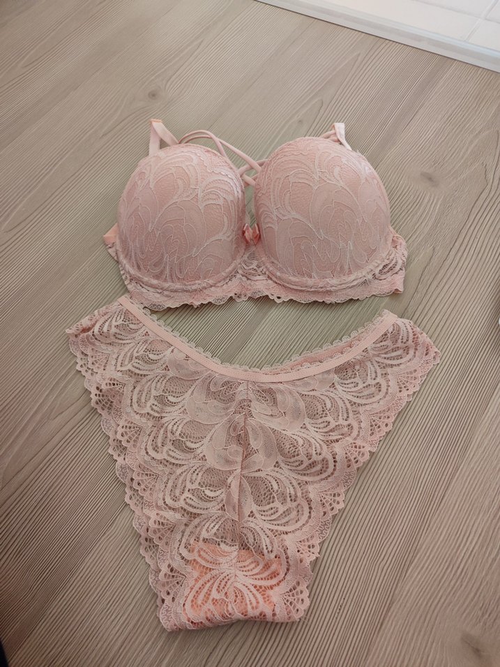 Pastel pembe renkte, bohem tarzda dantel detaylı sütyen ve külot takımı. Normal uzunlukta, İçi dolgulu yeni etiketli