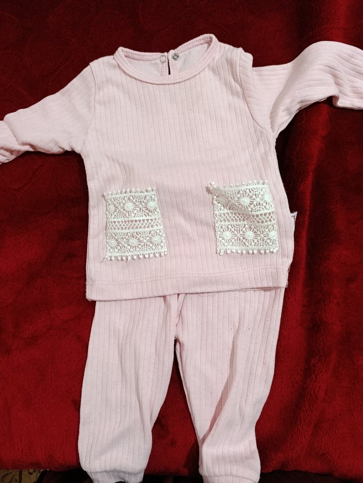 Uzun kollu, pastel pembe renkte bebek kız takımı. Dantel ceplerle süslenmiş, yumuşak ve rahat kumaştan üretilmiştir.