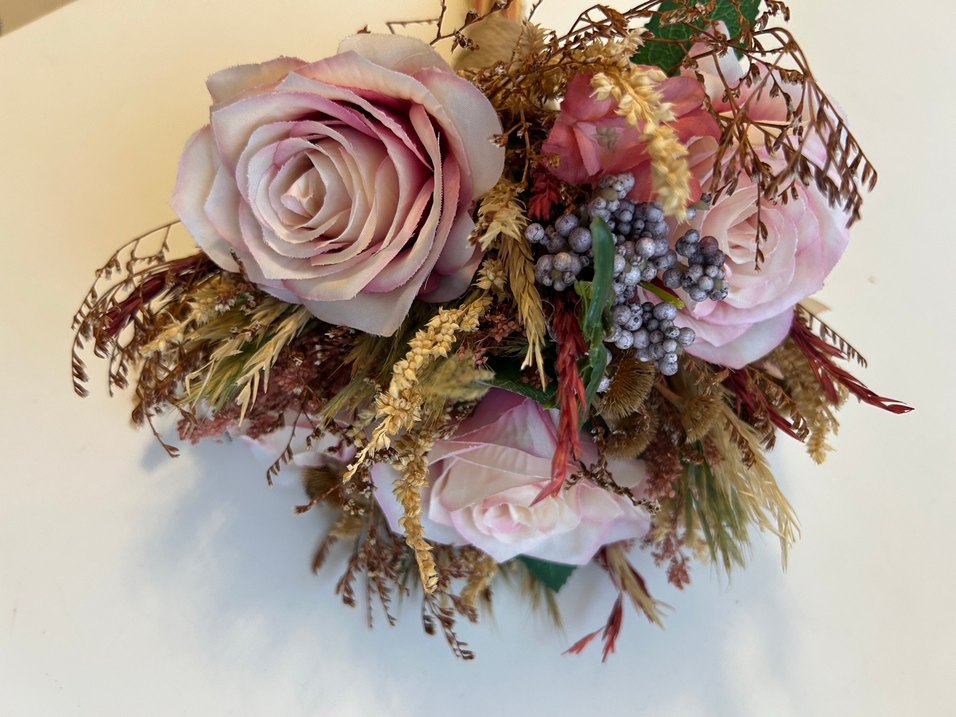 Pembe dantel detaylı, pastel tonlarda güller ve doğal kurutulmuş bitkilerle bohem tarzda hazırlanmış gelin buketi. Yaklaşık bi saat çekimde kullanıldı özel tasarlandı