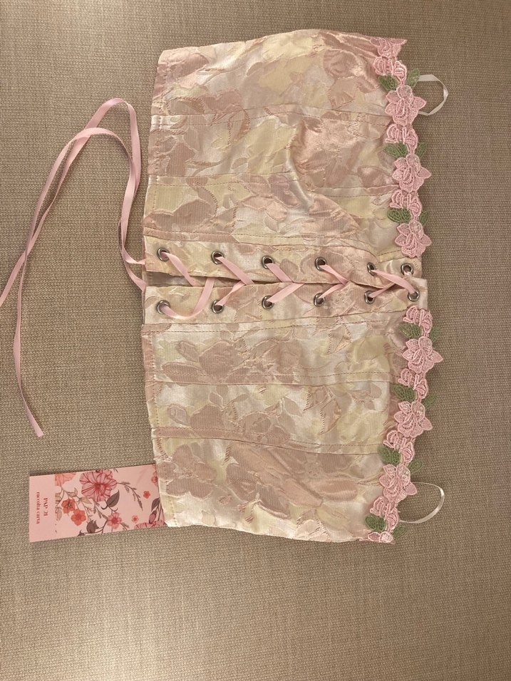 Pembe pastel renkli, dantel işlemeli ve ip askılı bu fitted büstiyer, vintage ve bohem tarzları romantik bir şekilde birleştirir.