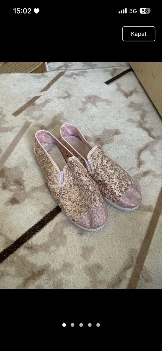 Pembe dantel detaylı, dolgu topuklu espadril. Yılan deseni ve kauçuk malzeme kullanılmış. Bohem tarzda, düğün için uygun.