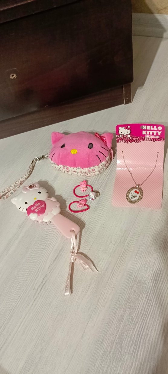 Pembe dantel detaylı, işlemeli Hello Kitty cüzdan, tarak, kolye ve iki saç tokası ve bir yüzükten oluşan bohem ve retro tarzda aksesuar seti.
