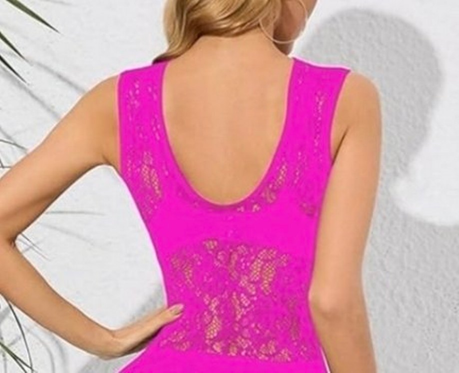 Canlı pembe renkte, dantel detaylı vücut çorabı. Kolsuz, vücuda oturan kesimi ve midi boyuyla parti için uygundur. her bedene uyumludur