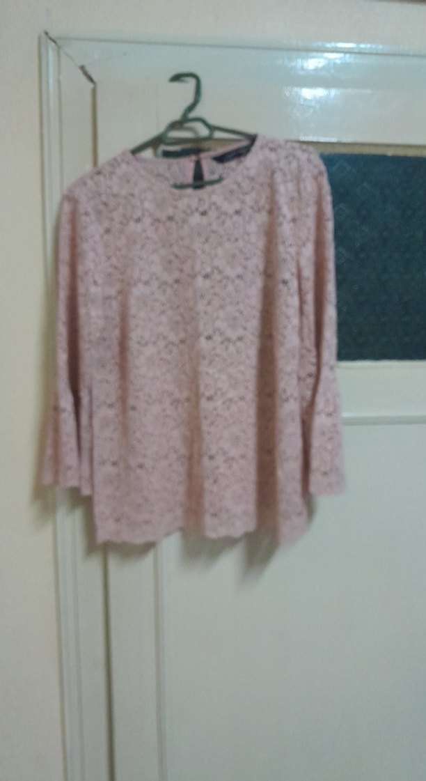 Pembe renkte, dantel detaylı, uzun kollu ve yuvarlak yakalı triko bluz. Rahat ve bol kesim, günlük kullanıma uygun.