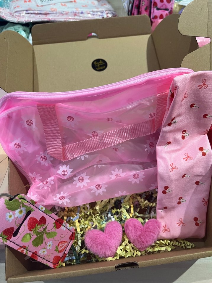 Pembe pastel renkte, dantel detaylı, baskılı desenlere sahip bohem tarzda kız aksesuar seti. Şeffaf bölmeli çanta ve yumuşak kalp figürleri içerir.