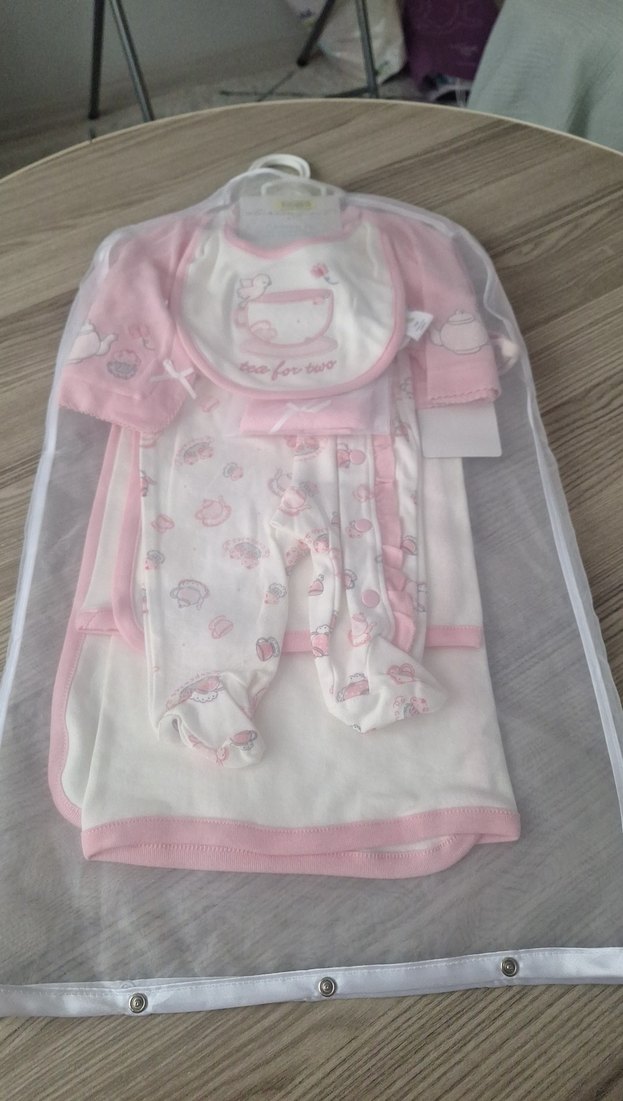 Pastel pembe tonlarda, dantelli ve baskılı desenlere sahip kız bebek kıyafet takımı. Kolsuz tasarımı ve uyumlu aksesuarlarıyla tamamlanmıştır.