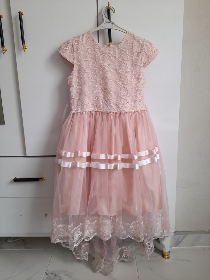 Pembe dantel detaylı, kısa kollu, yuvarlak yakalı, katmanlı ve ince dokulu kumaştan yapılmış kız çocuk elbisesi.