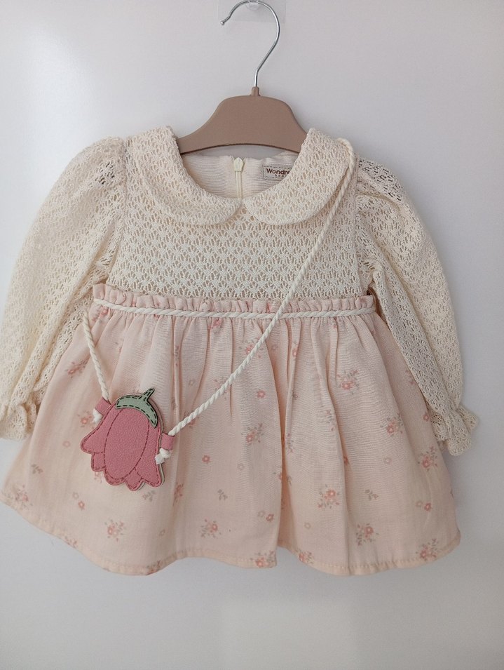 Pembe pastel renkli, dantel detaylı, uzun kollu, nakışlı ve geniş kesim bohem tarzda kız çocuk elbisesi. Bebe yakalı, işlemeli ve gül çantası ile birlikte. 9,12,24 Ay seçenekleri ile...