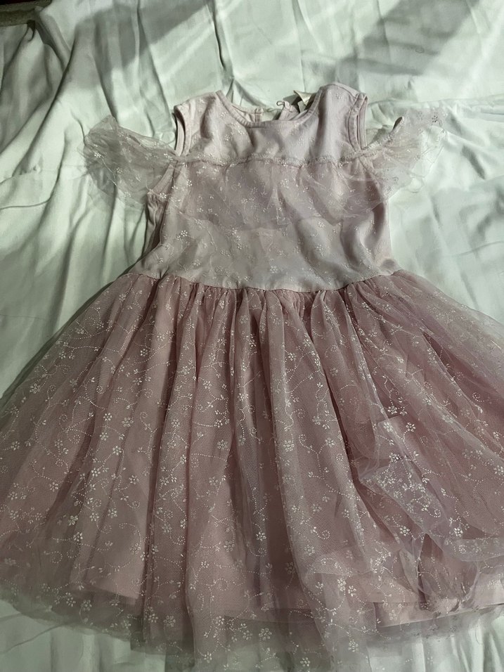 Pembe pastel renkli, nakışlı dantel detaylı kız çocuk elbisesi. Salaş kesim, kolsuz ve straplez yakalı bohem tarzda. Rengi daha canlı ama fotoğrafta soluk görünüyor