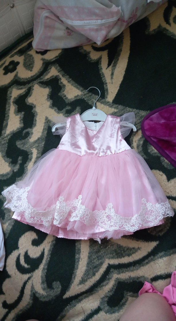 Pembe, dantel işlemeli, askısız yaka ve kolsuz detaylı, rahat kesim kız çocuk elbisesi, yumuşak sentetik kumaştan çeşit çeşit var bir adet gönderilir.