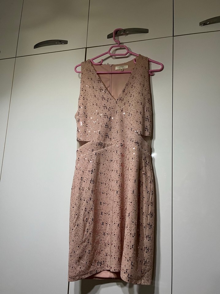 Dantel detaylı, V yakalı, pembe pastel renkte, yılan desenli, kolsuz ve midi uzunlukta, vücuda oturan elbise. Romantik akşamlar için ideal.