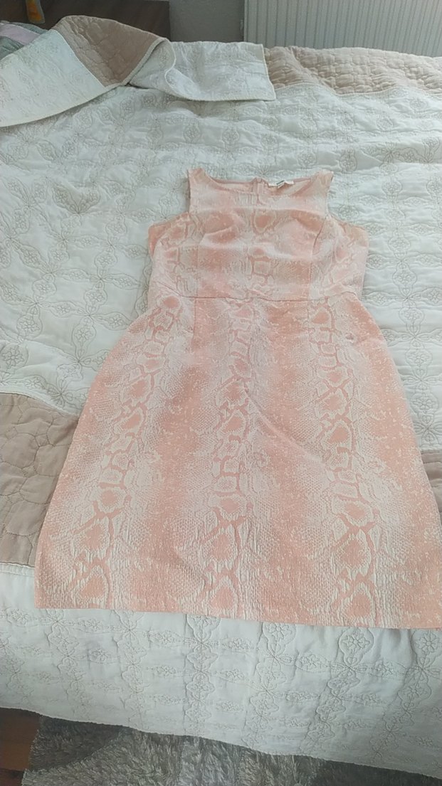 Pembe pastel tonlarında yılan desenli, dantel detaylı, straplez ve kolsuz midi elbise, klasik şıklık sunar.
