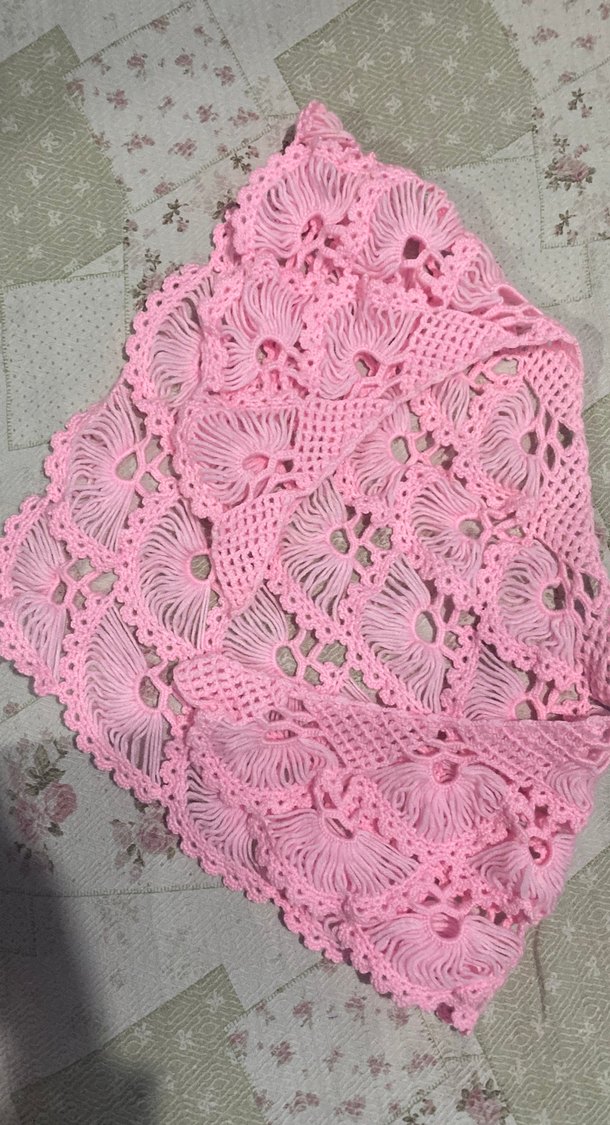 Pembe renkli, dantel detaylı örgü bebek şal, bohem ve retro tarzıyla rahat bir görünüm sunar.