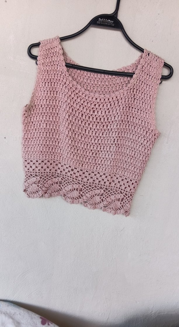 Pembe pastel tonlarda, dantel detaylı örgü crop top. Kayık yaka ve kolsuz, bol kesim, kısa boyda rahat bir modeldir.