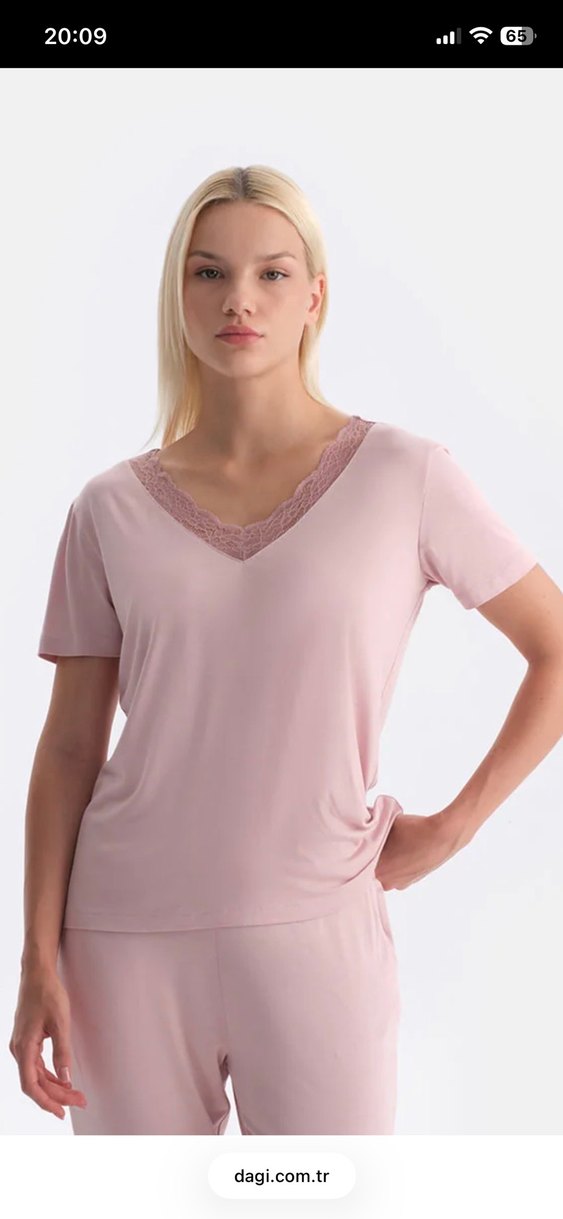 Pembe renkte, yumuşak pamuklu kumaştan, dantel detaylı kadın üst, beden S. Marka: DAG Sleepwear. Pantolon pijaması 90 cm üst iki kol arası 45 cm