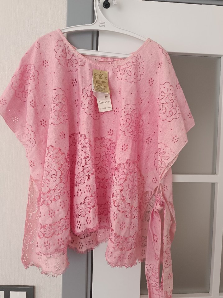 Pembe renkte, dantel detaylı, kısa kollu, straplez yakalı, bol kesim bohem tarzda kısa pareo. plaj kullanım için uygundur.