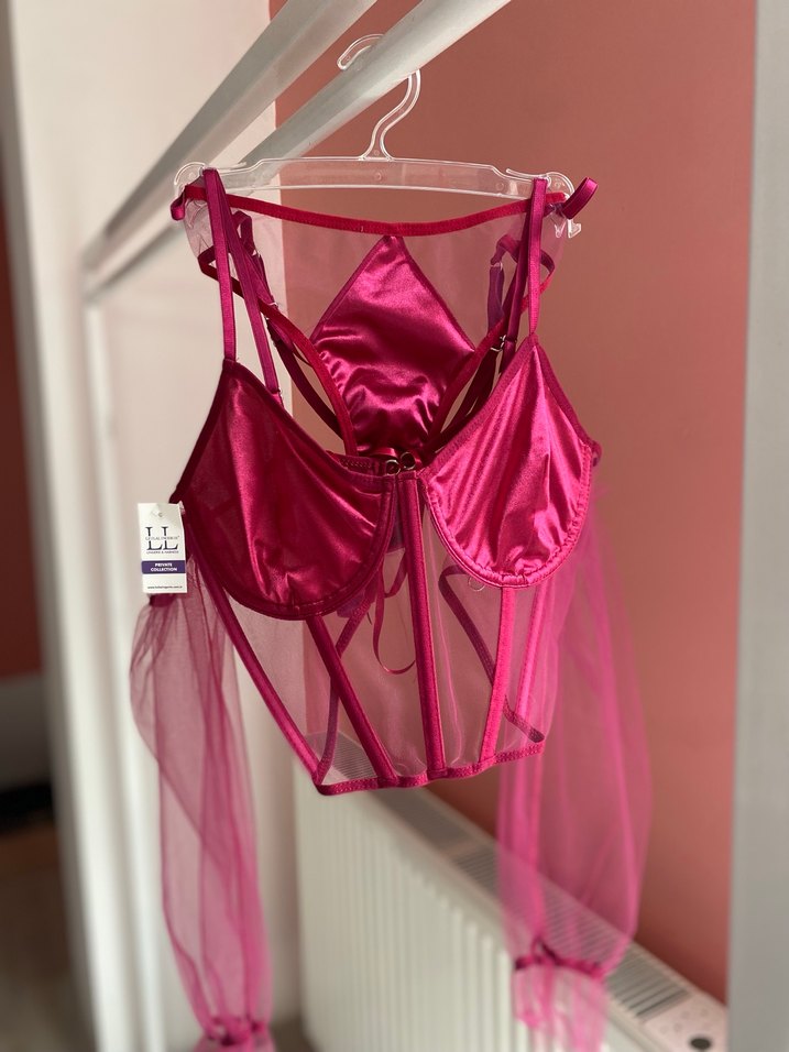 Parlak pembe saten kumaştan, dantel detaylı, halter yaka ve askılı kol tasarımına sahip, vücuda oturan midi uzunlukta göğüs korse. Romantik buluşmalar için uygun. ✨