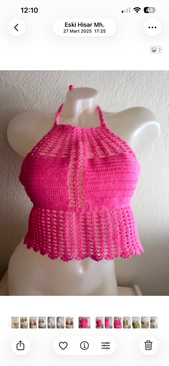 Pembe renkli, dantel detaylı, straplez ve askılı kısa örgü bustiyerdir. Bohem tarzına uygun, vücuda oturan ve canlı renklere sahiptir. El örgüsüdür. Giyilmeden satışa çıkarıyoruz.