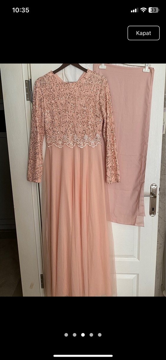 Pembe renkte, uzun kollu, dantel detaylı, yuvarlak yaka ve bol kesim uzun abiye elbisedir. Pastel tonlarda, düğünler için uygundur. Bir kere kullandım. iki kol arası 50 cm boyu 150 cm iç göstermez .şal fiyata dahil değildir m