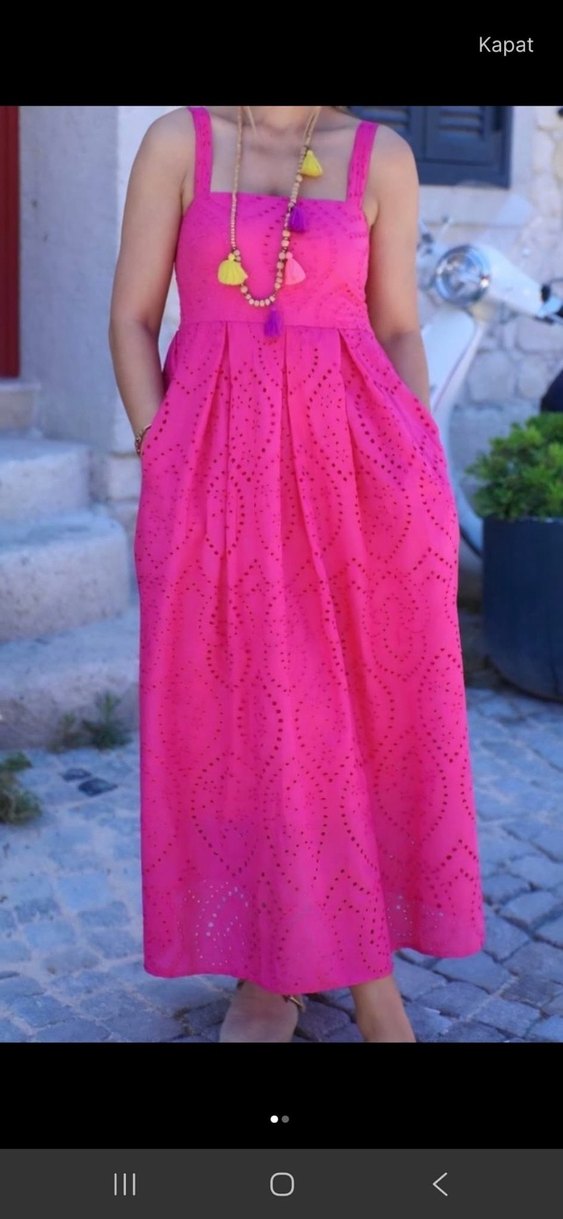 Pembe renkli, dantel işlemeli uzun bohem elbise. Askılı, straplez yaka ve bol kesim, yumuşak sentetik kumaştan, düğün için uygun.