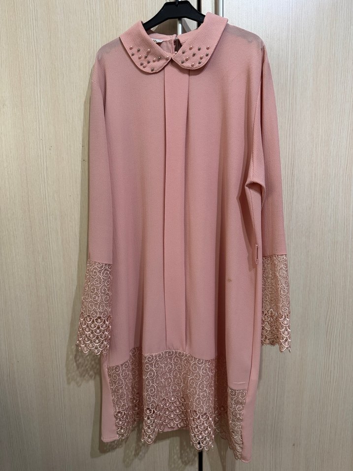Yüksek yakalı, gevşek kesim pembe uzun tunik. Kollar ve etek ucu dantel detaylı, yumuşak sentetik kumaştan üretilmiştir. Ofis için uygundur.