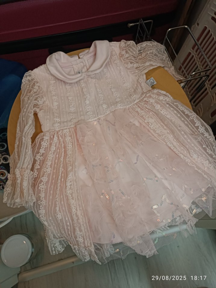 Pembe pastel tonlarda, yakalı ve uzun kollu, bol kesim kız elbisesi. Yumuşak sentetik kumaş üzerinde işlemeli dantel detaylar bulunur.