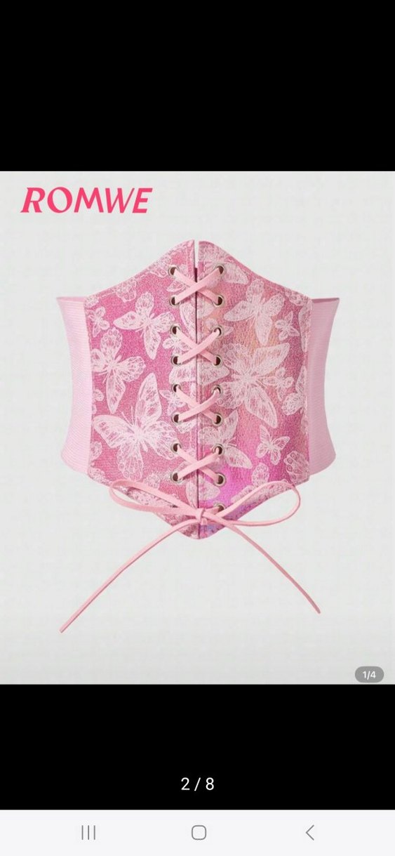 Pembe, dantel detaylı ve işlemeli kelebek desenli, straplez ve bağcıklı ön kısmı olan, yumuşak sentetik kumaştan yapılmış dar kesim bir büstiyer.