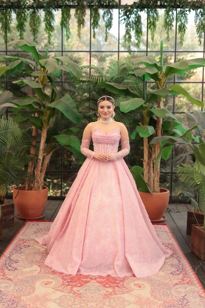 Pembe Dantel İşlemeli Uzun Nişan Elbisesi