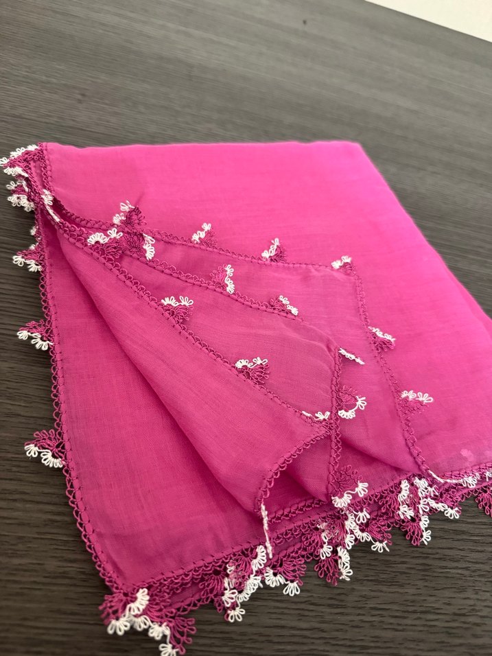 Pembe tekstil kumaştan, dantel kenarlı bu kadın fuları renkli ve bohem tarzı yansıtır. Retro ve hippie stillere uygun geleneksel tasarıma sahiptir.