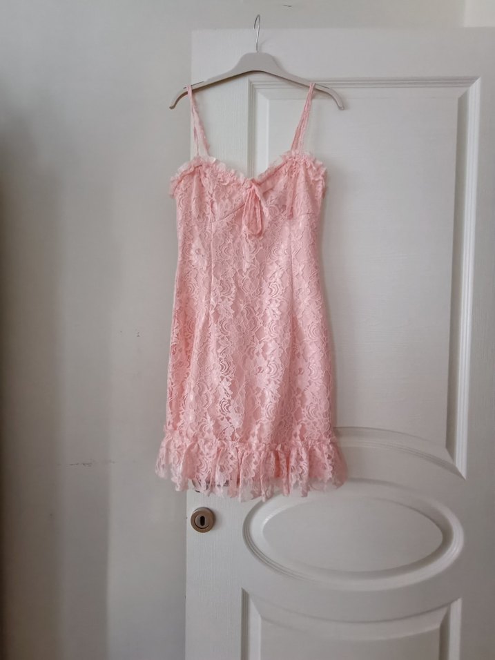Pastel pembe renkte, ince askılı ve straplez yakalı, dantel detaylı, vücuda oturan midi elbise. Romantik akşamlar için uygundur.