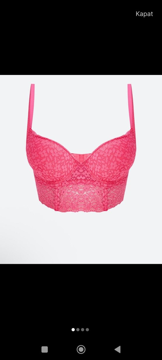 Pembe renkte, pop kültür esintili, göz alıcı midi uzunlukta, dantelli sütyen. Desensiz, canlı ve renkli görünüme sahip. bir kez denendi 75B alt kısmı kesilerek kısaltılmıştır