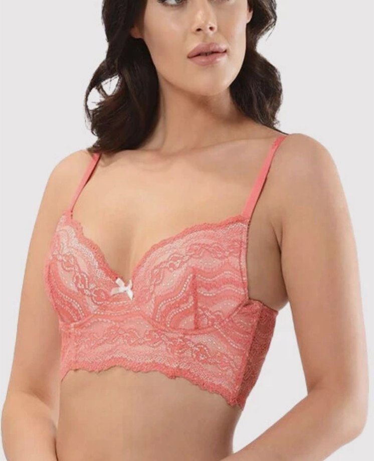 Pastel pembe renkte, kısa uzunlukta, dantel detaylı ve ortasında küçük fiyonk bulunan bohem tarzda sütyen.