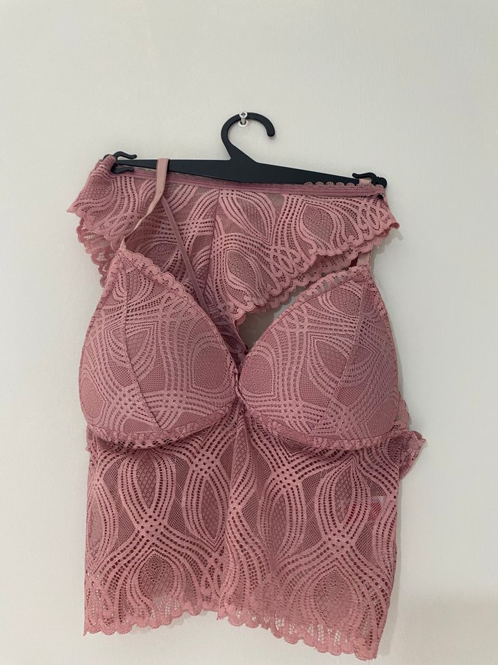 Pastel pembe renkte, kısa ve mini boyda, bohem dantel tasarımlı zarif sütyen takımı.