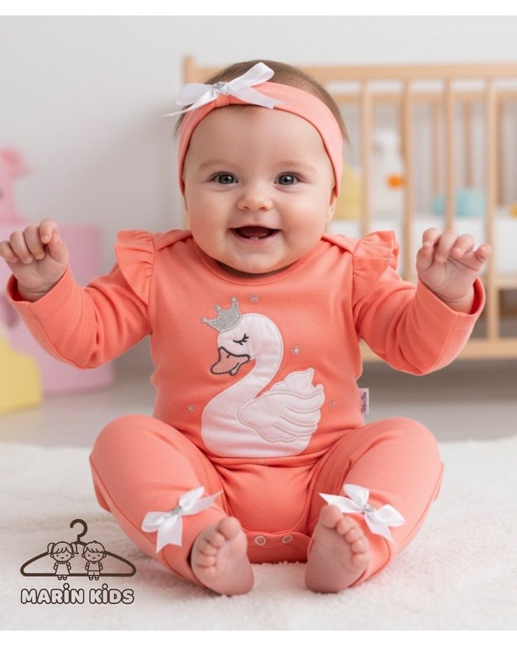 Dantel detaylı, nakış işlemeli kuğu figürlü pastel pembe bebek kız tulumu.fiyonk detaylı saç bandı ile birlikte. Kuğu detaylı pamuklu ikili takımımız badana hediyesiyle 3-6-9 ay seçenekleri ile stoklarımızda mevcuttur.