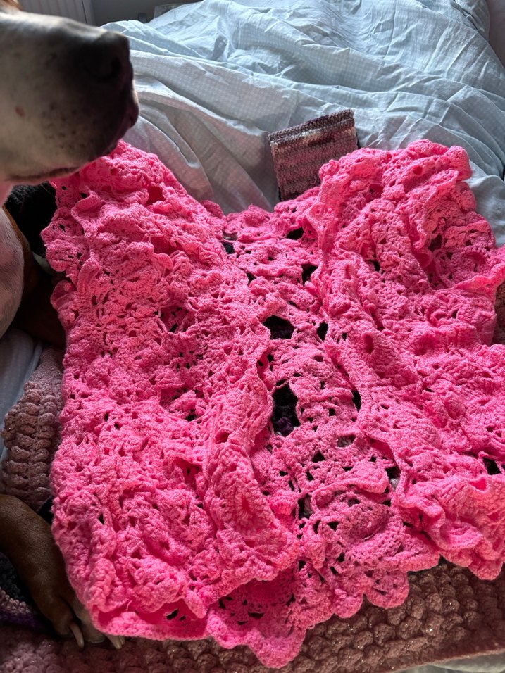 Pembe renkli örgüden yapılmış, dantelli kız çocuk bolero. Askısız yaka, kolsuz ve bol kesim bohem tarzda.