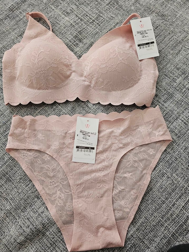 Pastel pembe renkte, dantel detaylı sütyen ve midi külot takımı. Dalgalı uçlu kenarları ve rahat athleisure tarzıyla konfor sunar. Normal uzunlukta askılıdır. sıfır suwen marka etikeltli hiç kullanılmadı