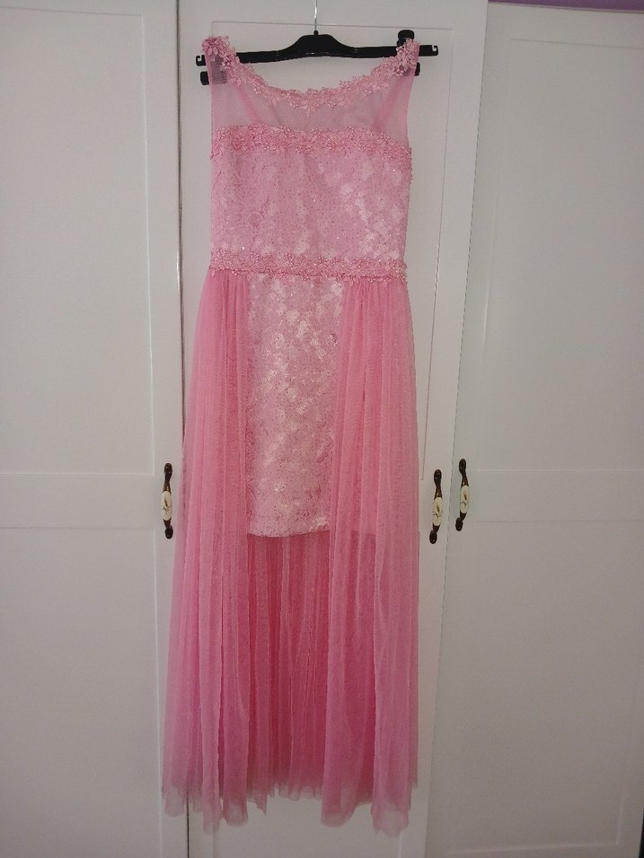 Pembe pastel tonlarında, dantel detaylı, straplez ve kolsuz, bohem tarzda, uzun ve vücuda oturan abiye elbise. 1 kere mezuniyet için kullanıldı