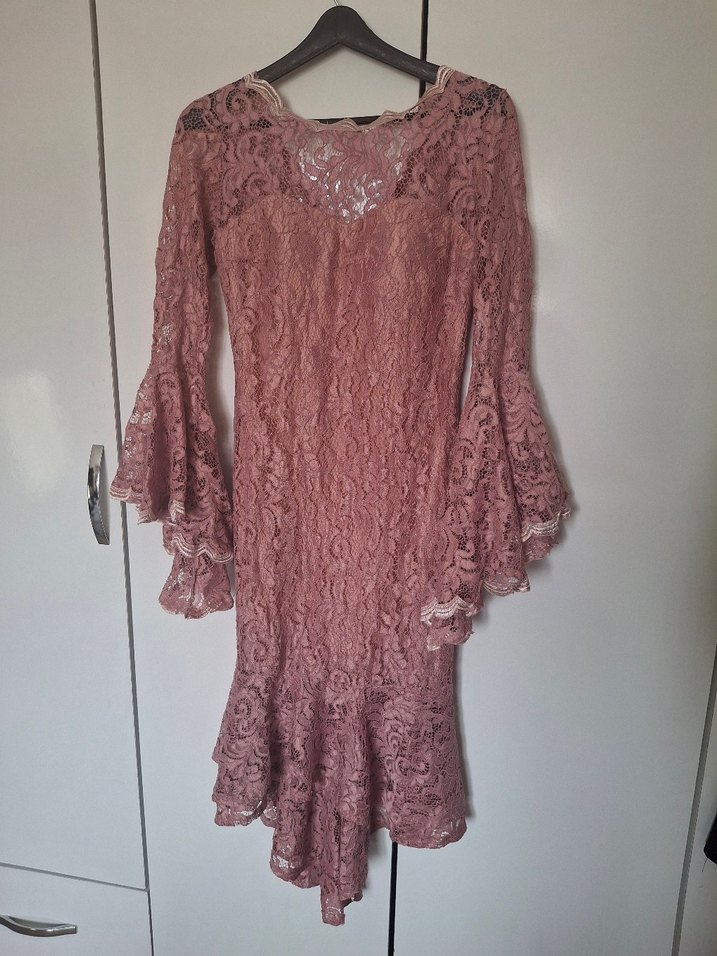 pembe renk, desenli dantel kumaştan yapılmış, uzun kollu, bohem tarzda, vintage esintili, düğünlere uygun dar kesim elbise. marka temsilidir. hiçbir kusuru yok. 1 2 kez kullanıldı. ihtiyaç fazlası. 36 38 bedenlere uygun