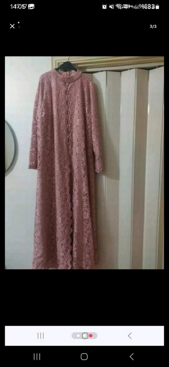 Pastel pembe renkte, yüksek yakalı ve uzun kollu, dantel detaylı, triko kumaştan yapılmış, bol kesim uzun elbisedir. Günlük kullanıma uygun, mütevazı ve vintage tarzda.