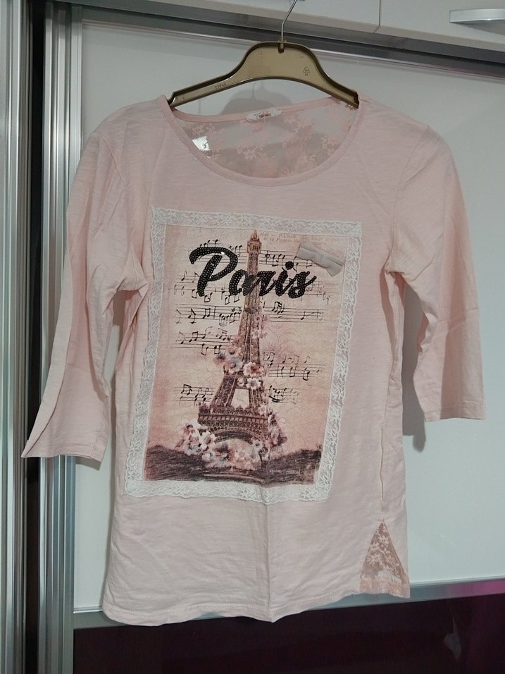 Pamuk kumaştan yapılmış, 3/4 kollu ve yuvarlak yakalı. Paris baskısı ve dantel detaylarıyla dikkat çeker. Yetim kol pembe renkli sırtında ve yanlarında dantel detaylı xside marka m beden tshirt