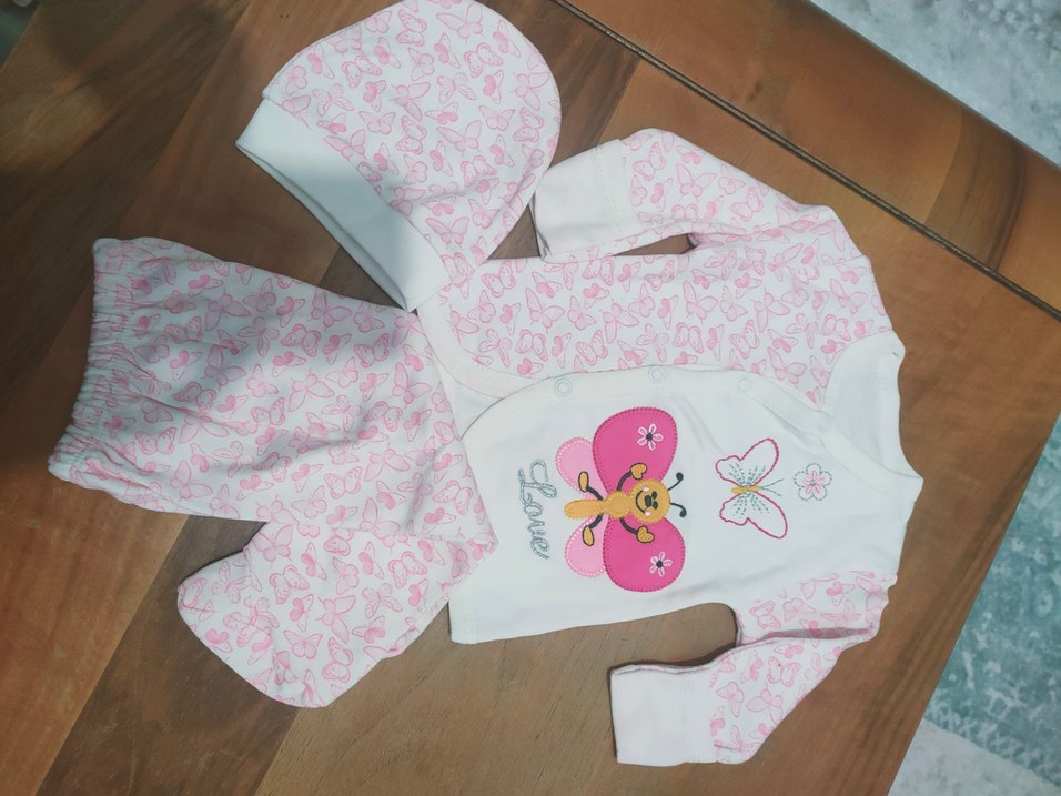 Pastel pembe renkte kelebek desenli, dantelli bebe kız hastane kıyafeti. Uzun kollu üst ve uyumlu şapka içerir.