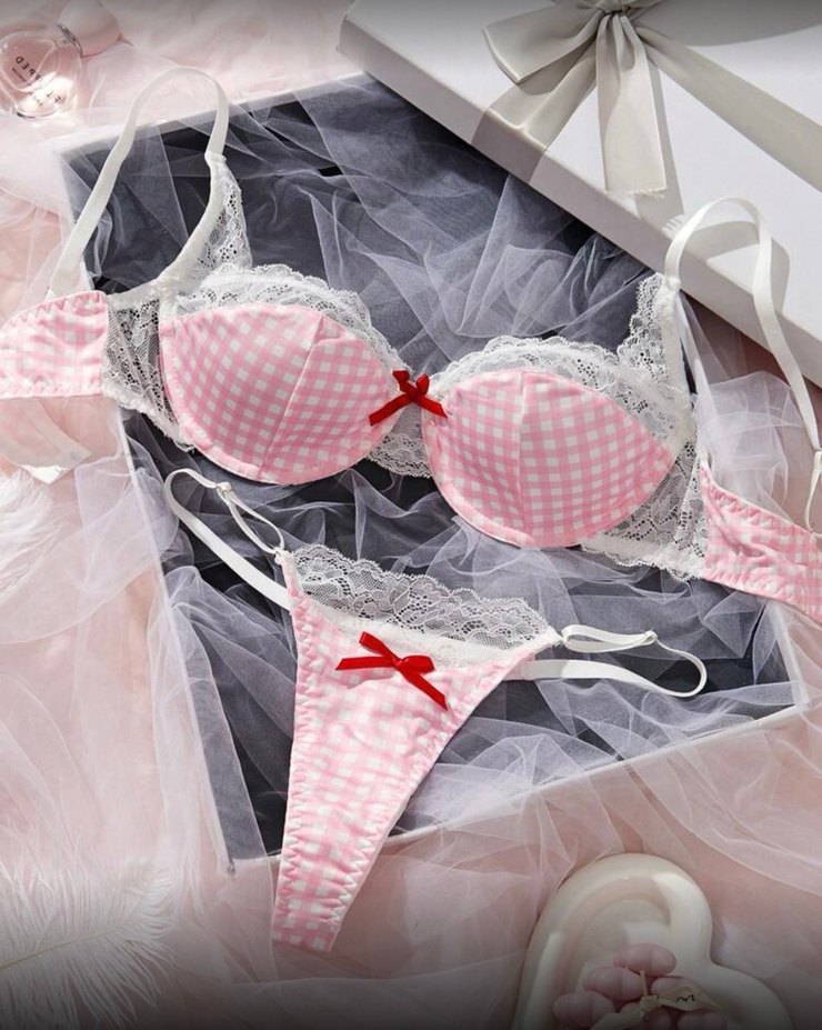 Bedenimden büyük aldığım için hiç giymedim poşetiyle gelecektir. Pembe kareli desene sahip, beyaz dantel detaylı ve kırmızı fiyonk süslemeli Paris tarzı bohem midi sütyen takımı.