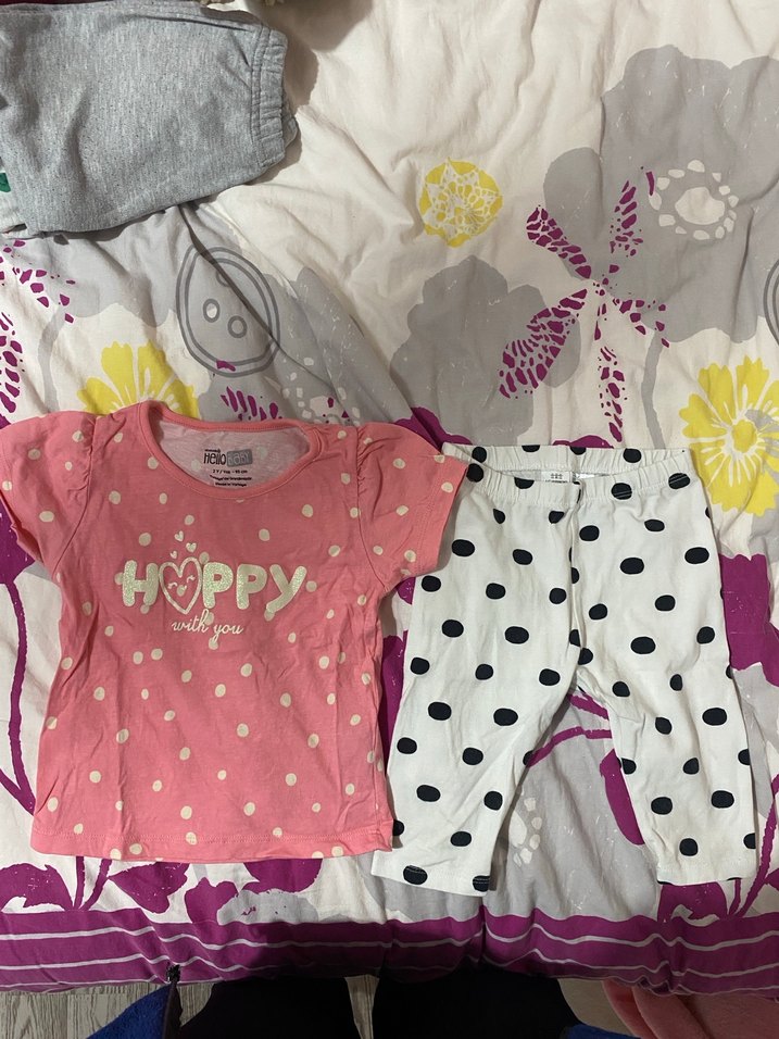 Pembe, dantelli ve renkli desenli kısa kollu üst ile siyah puantiyeli beyaz tayt içeren kız bebek takımı. Üstte "HOPPY" yazısı bulunur. 18 24 ay temiz