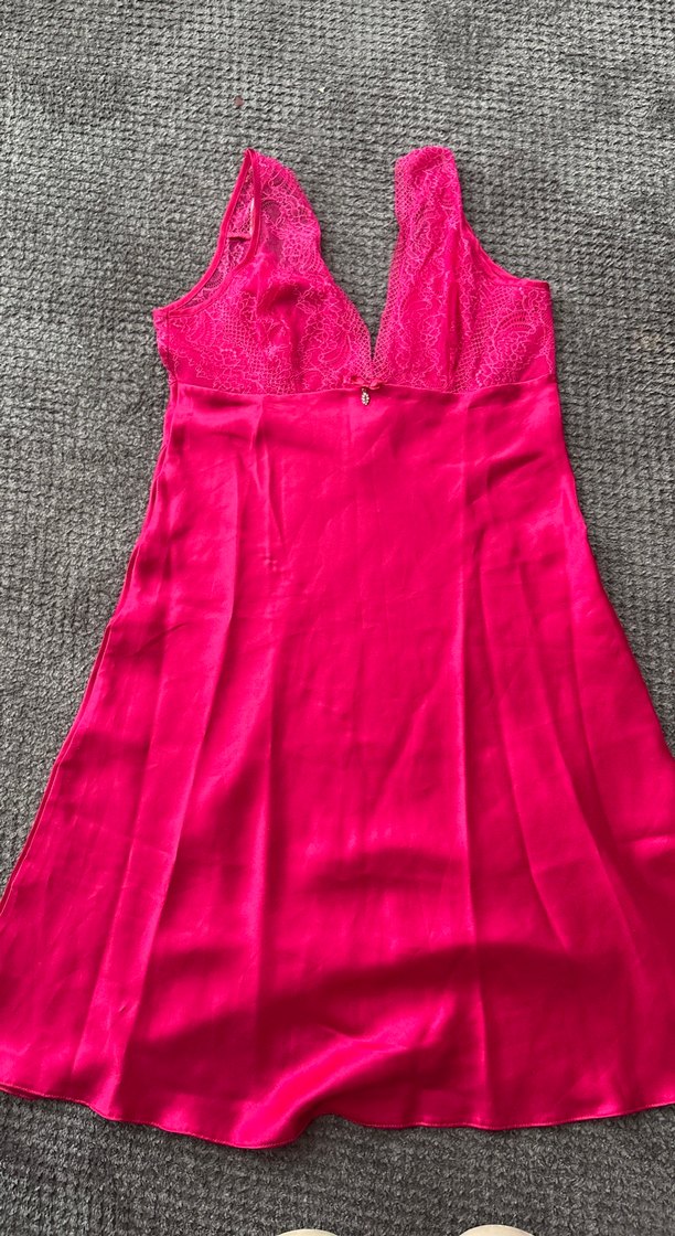 Pembe parlak kumaştan, dantelli üst kısmı ve kolsuz tasarımıyla rahat ve bohem tarzda, vücuda oturan midi gecelik.
