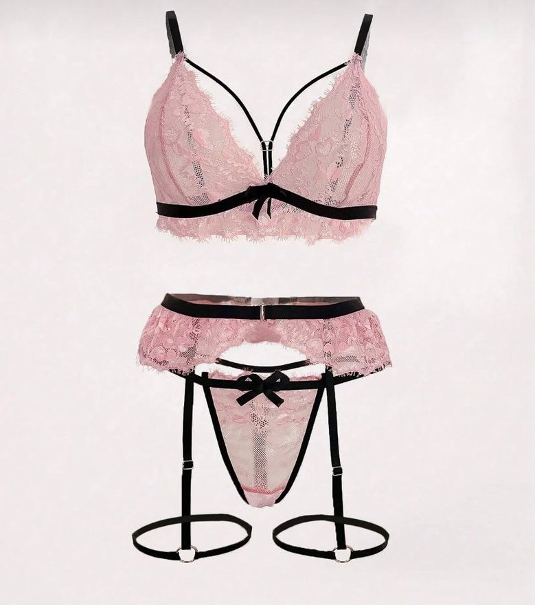 Pastel pembe renkte, kısa kesim dantel sütyen ve siyah detaylı jartiyer ile Parisian Goth tarzını yansıtan takım.