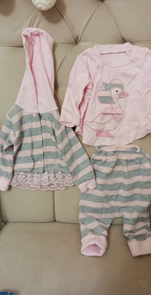 Uzun kollu pembe üst, nakışlı ördek figürü, çizgili pantolon ve dantelli çizgili ceket içeren bebek kız takımı. Pastel renklerle yumuşak ve rahat.